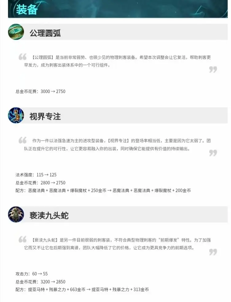 有意思的是亵渎九头蛇和公里圆弧进行了大降价,我们能看到ad刺客的更多登场吗?或者像之前宙斯那样做刺客流剑魔,不知道大家对这个版本如何评价,如何看待这个版本的优先级