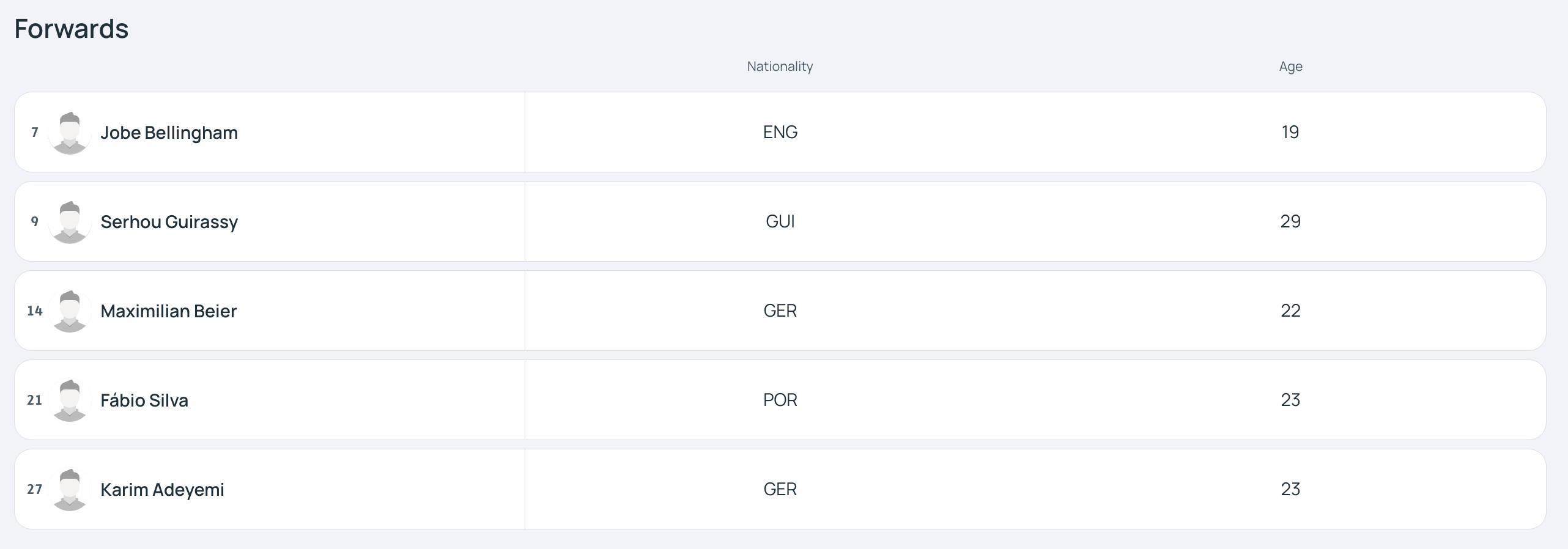 7-乔布-贝林厄姆、9-吉拉西、14-拜尔、21-法比奥-席尔瓦、27-阿德耶米